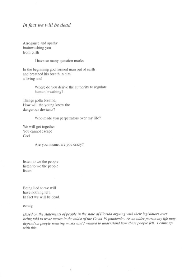 On the above:  I transcribed the statements from a CNN video of residents arguing against a Palm Beach, Florida commission’s order that masks be worn — except for the last three lines which come from a subsequent meeting in Saint Lucie, Florida.